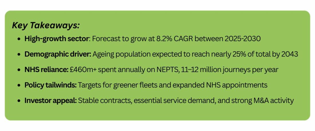 With NHS pressures mounting, an ageing population, and increased reliance on private sector transport, the market for private health transport businesses is thriving. The NHS’s £500 million annual spend on NEPTS, coupled with expanding NHS subcontracting opportunities, makes this a strategic time to invest.